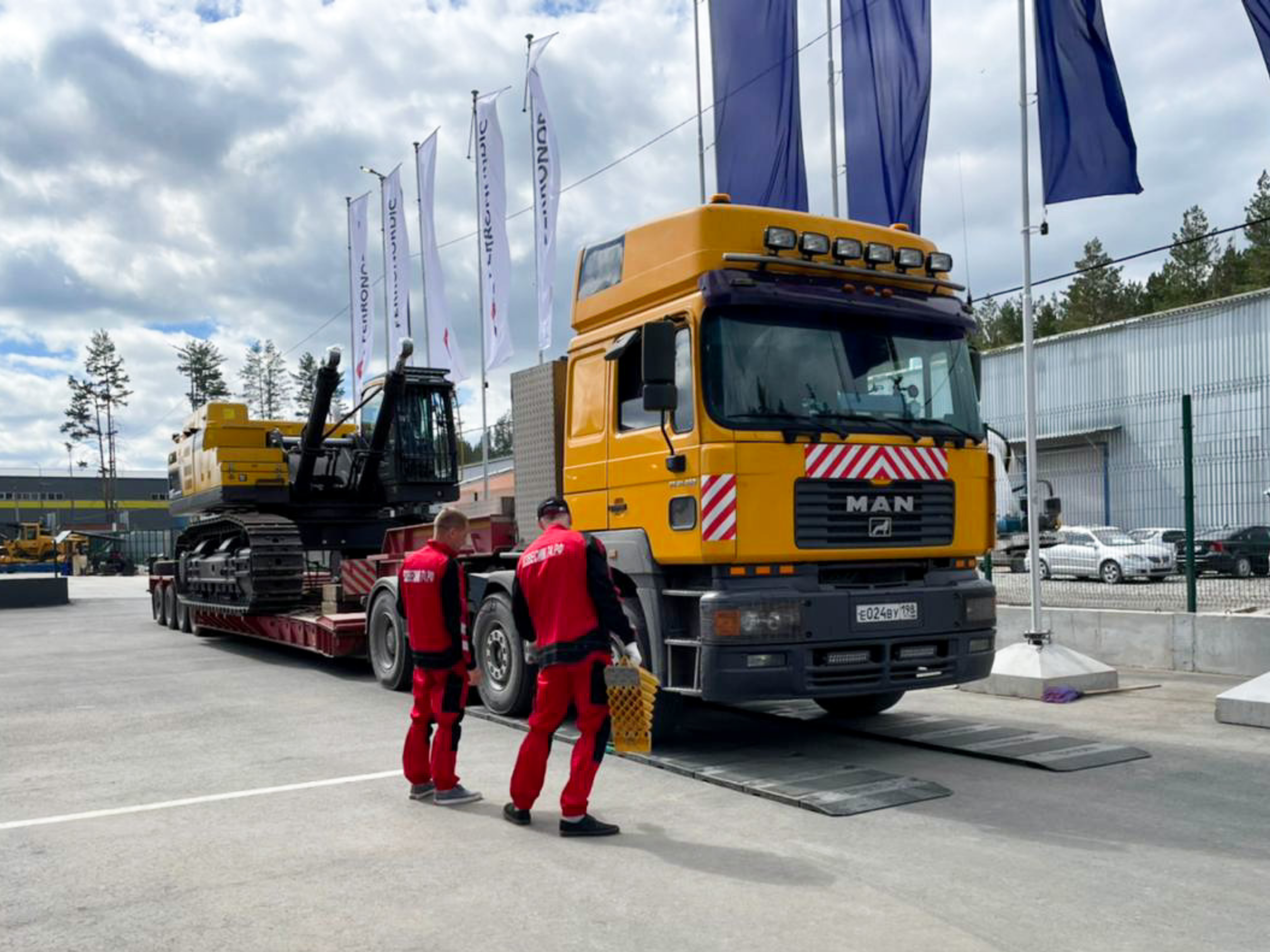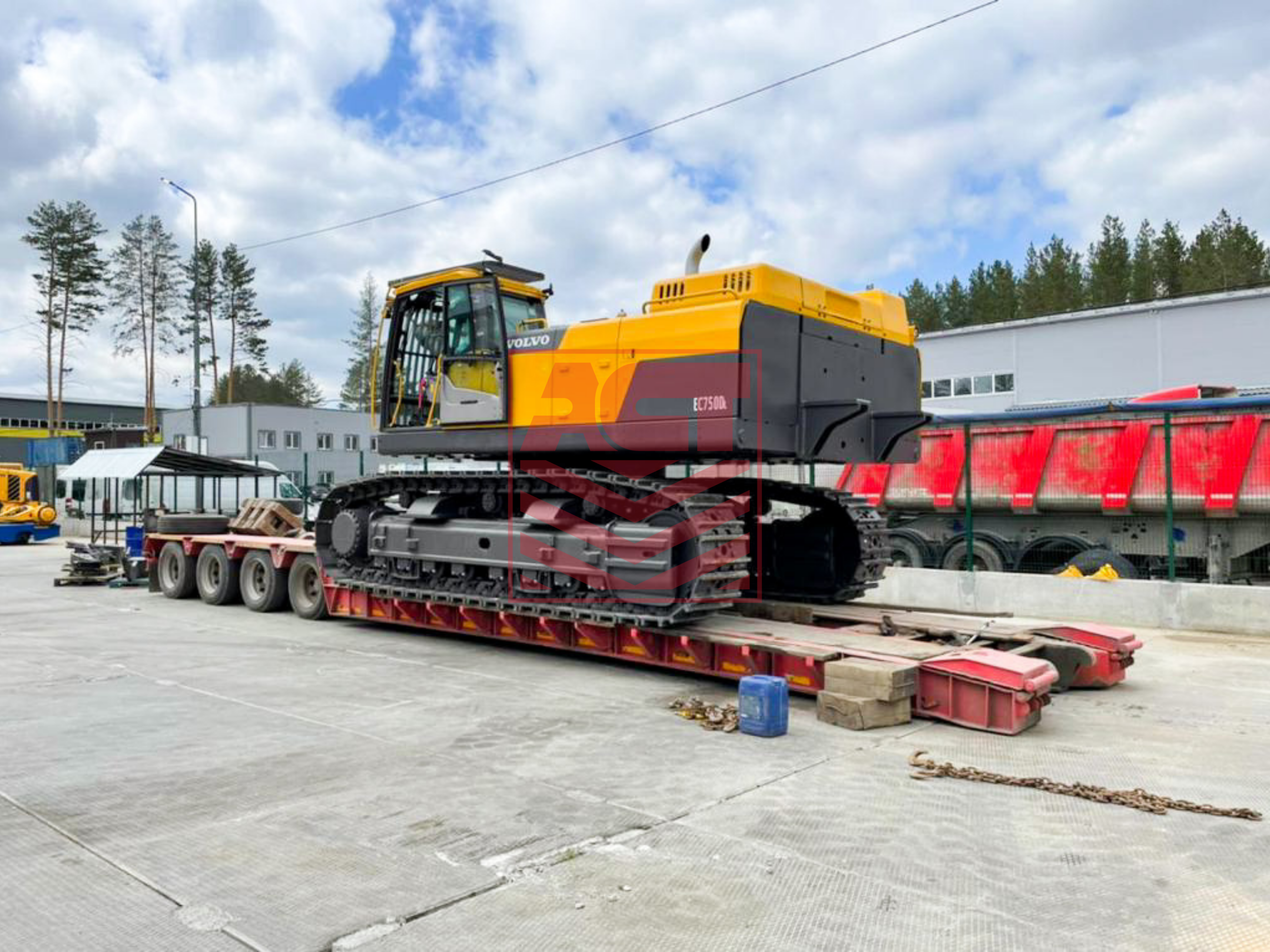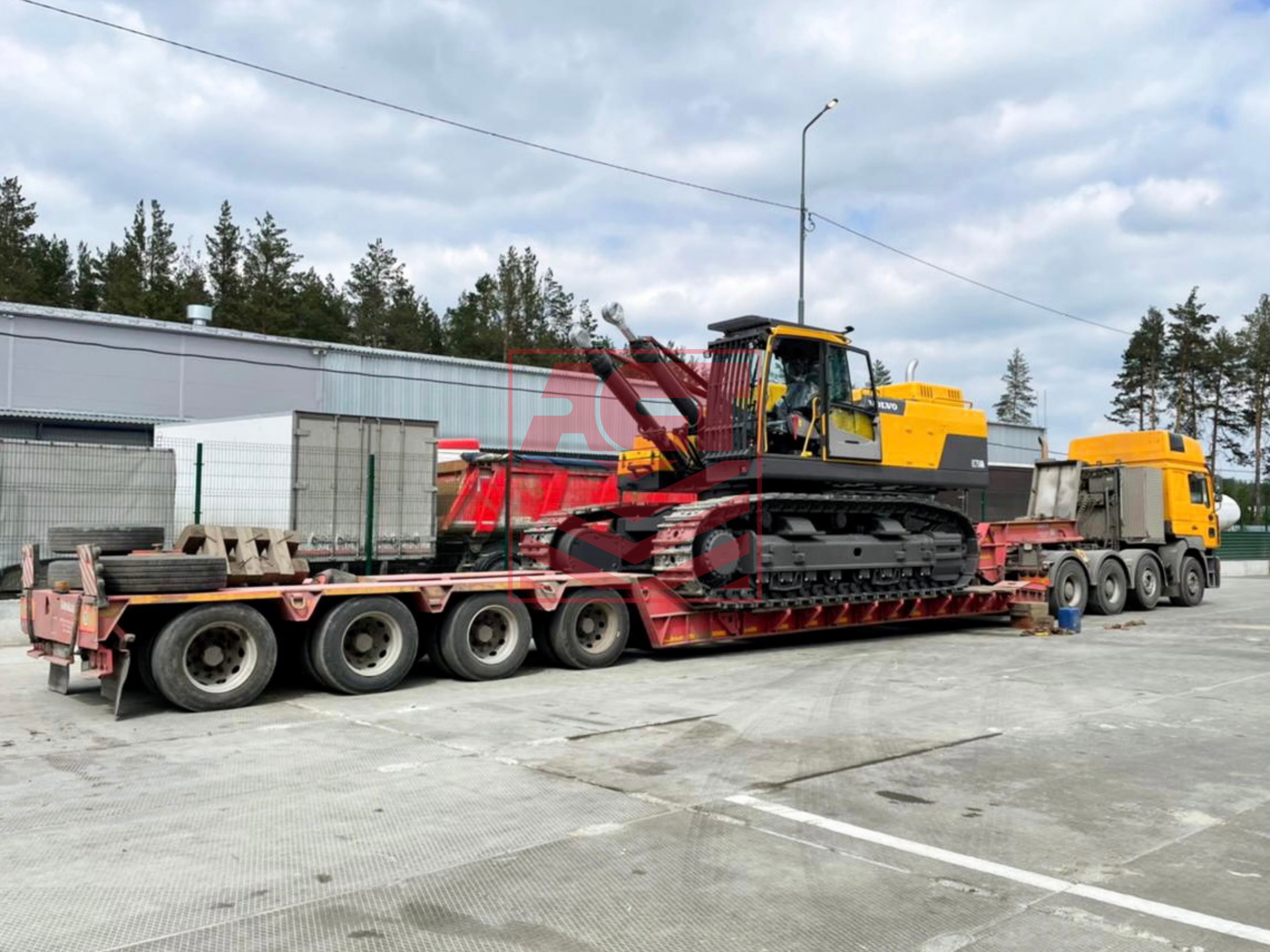 Перевозка экскаватора Volvo EC750DL проходила с использованием 3-х автопоездов. Основное тело экскаватора погрузили на низкорамный полуприцеп, а комплектующие (стрела, рукоять, противовес, ковш, ящик) отправили на 2-х еврофурах.