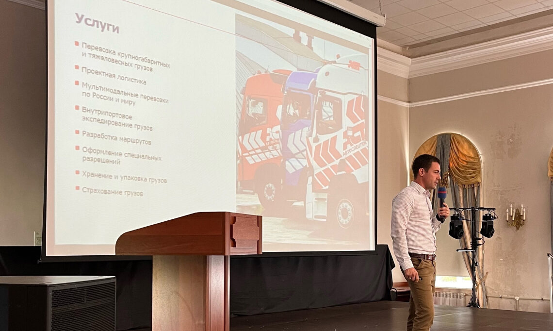 Александр Большаков, коммерческий директор и Игорь Арефьев, заместитель генерального директора рассказали студентам о логистике в сфере крупногабаритных и тяжеловесных грузов, а также о получении спецразрешений и оформлении спецпроектов.